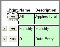 The toggle button on at the very top of the column controls all of the print buttons in the column beneath it. For example, if the button is marked ”no” and you click on it once, the text on the button changes to "yes" and the all of the buttons underneath change to ”yes” as well. This means that all of the sheets in your workbook will print when you use the print command.