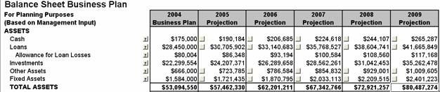Notice also that the F-5YR Sheet reflects the $80,487,274 in total assets projected on the Growth Chart (middle column of the Asset Growth Rate section, on the Dec 2009 line). This projection can be changed by altering the 8% growth rate on the Growth Chart.